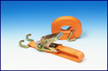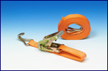 Completo ancoraggio confezionato con tenditore a cricchetto 25 mm. 800 Kg. Nastro di PE larg. mm. 25 c.r. 1.200 Kg., ganci ad uncino alle estremità lunghezza standard mt. 0,20 + 5,00 mt. |