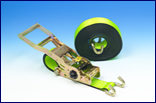 Completo ancoraggio confezionato con tenditore a cricchetto 50 mm. 5.000 Kg. ERGONOMICO MANIGLIA LUNGA, nastro di PE larg. mm. 50 c.r. 6.000 Kg., con ganci sponda alle estremità lunghezza standard